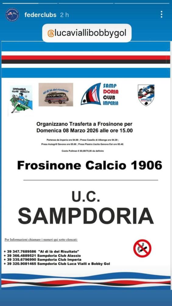 La Federclubs ha pubblicato tramite i propri canali social l'elenco dei club che organizzano la trasferta per seguire la Sampdoria a Frosinone. La gara è in programma domenica 8 marzo alle 15 allo stadio Stirpe. Di seguito tutte le informazioni: