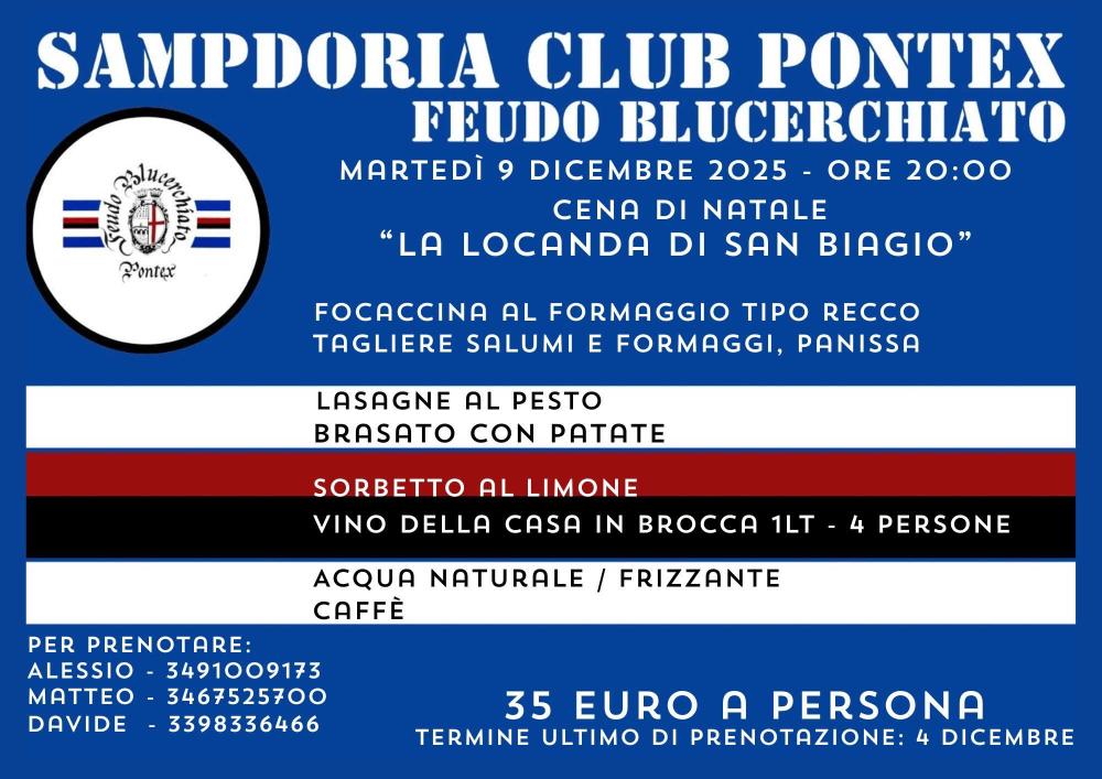 Il Sampdoria Club Pontex Feudo Blucerchiato ha comunicato le info per la propria festa Natalizia: