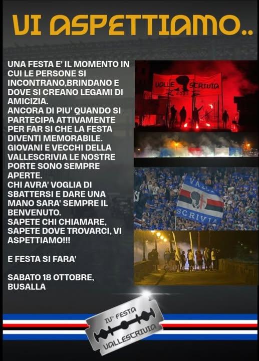 Sabato 18 ottobre si terrà la festa del Vallescrivia a Busalla. Il gruppo dei tifosi della Sampdoria pubblica sui social um messaggio di invito.